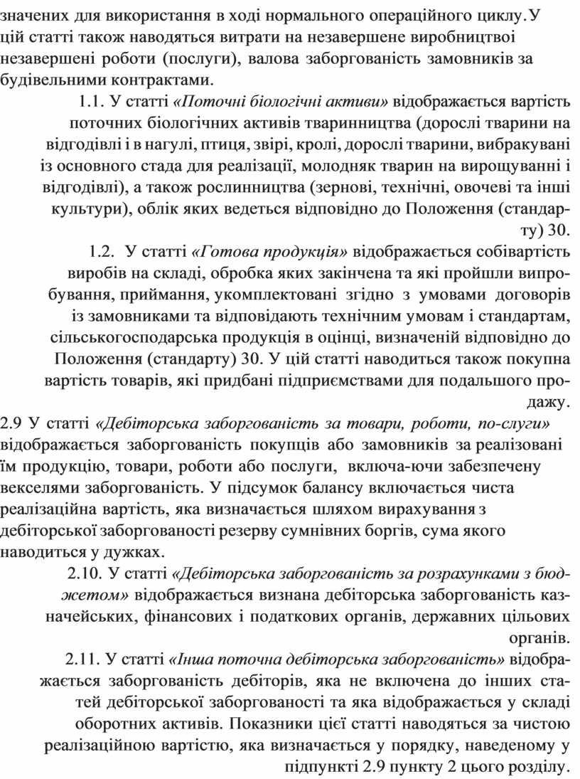 2.7. У статті «Поточні біологічні активи» відображається вартість поточних біологічних активів тваринництва (дорослі тварини на відгодівлі і в нагулі, птиця, звірі, кролі, дорослі тварини, вибракувані із основного стада для реалізації, молодняк тварин на вирощуванні і відгодівлі), а також рослинництва (зернові, технічні, овочеві та інші культури), облік яких ведеться відповідно до Положення (стандар- ту) 30.