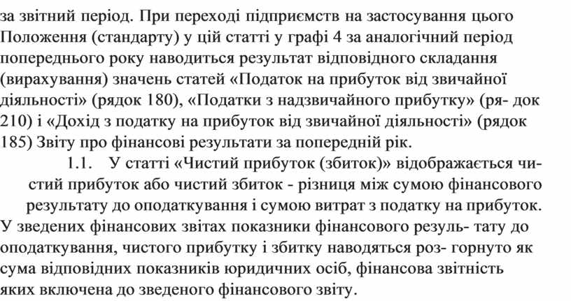 за звітний період. При переході підприємств на застосування цього Положення (стандарту) у цій статті у графі 4 за аналогічний період попереднього року наводиться результат відповідного складання (вирахування) значень статей «Податок на прибуток від звичайної діяльності» (рядок 180), «Податки з надзвичайного прибутку» (ря- док 210) і «Дохід з податку на прибуток від звичайної діяльності» (рядок 185) Звіту про фінансові результати за попередній рік.