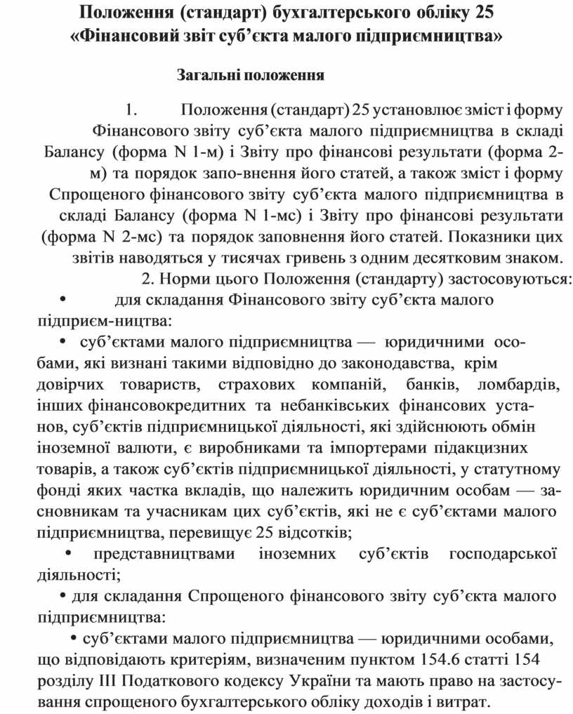 1. Положення (стандарт) 25 установлює зміст і форму Фінансового звіту суб’єкта малого підприємництва в складі Балансу (форма N 1-м) і Звіту про фінансові результати (форма 2-м) та порядок запо- внення його статей, а також зміст і форму Спрощеного фінансового звіту суб’єкта малого підприємництва в складі Балансу (форма N 1-мс) і Звіту про фінансові результати (форма N 2-мс) та порядок заповнення його статей. Показники цих звітів наводяться у тисячах гривень з одним десятковим знаком.