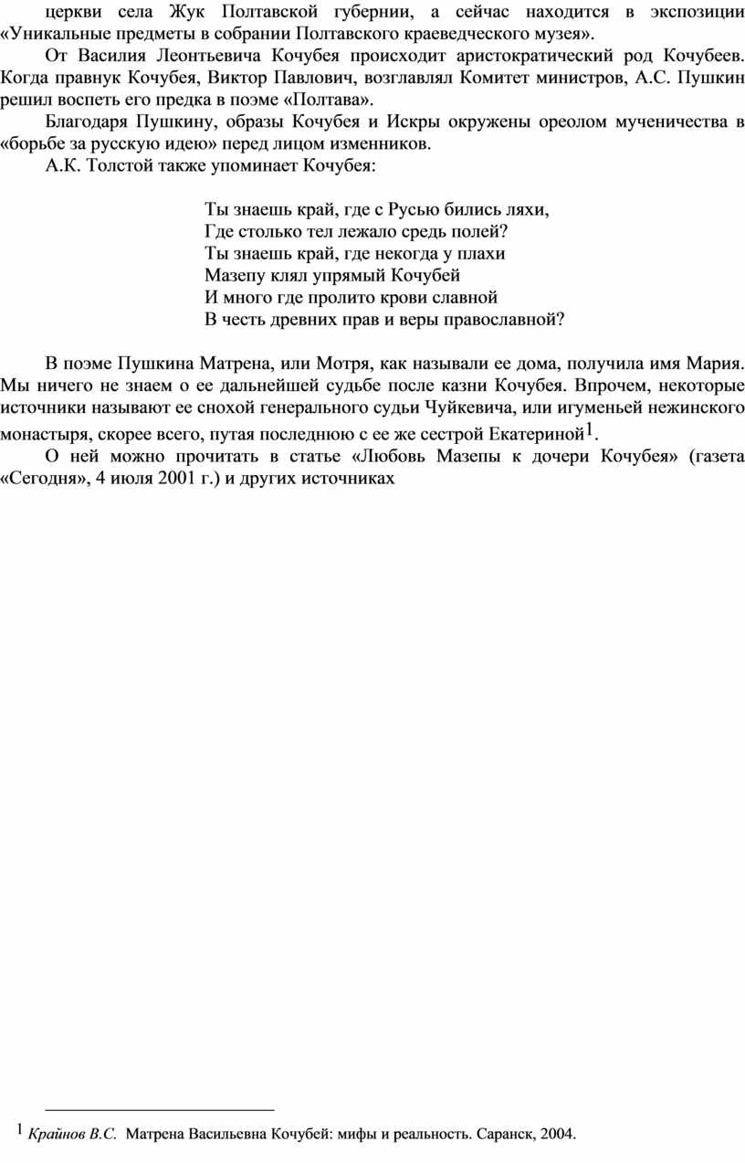 [1] Крайнов В.С. Матрена Васильевна Кочубей: мифы и реальность. Саранск, 2004.