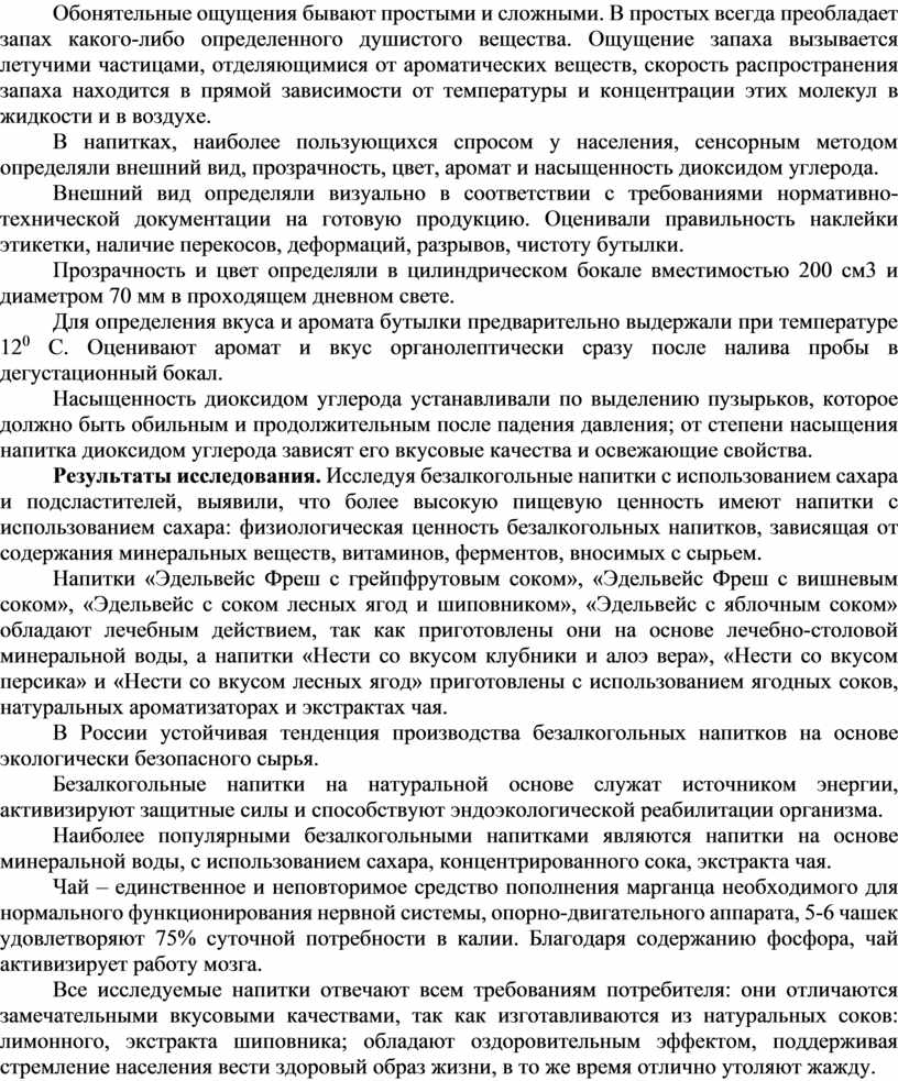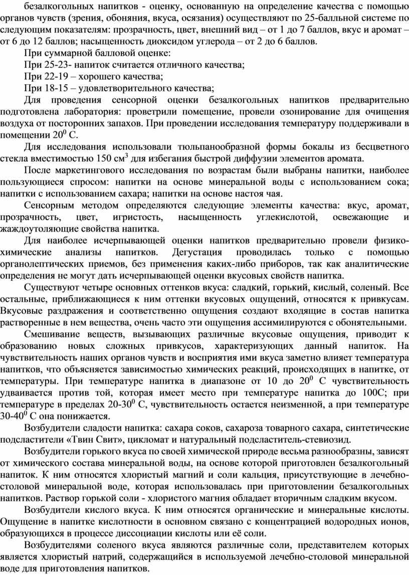 Объект исследования - различные типы безалкогольных напитков. Методы исследования: теоретический; сенсорный. Практическая значимость: формирование профессиональных навыков, необходимых для дальнейшей практической деятельности.