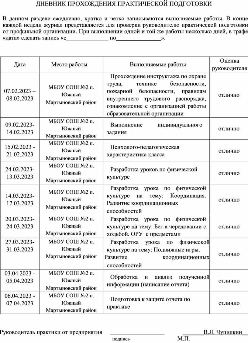 Руководитель практики от предприятия _______В.Л. Чупилкин__ подпись М.П.