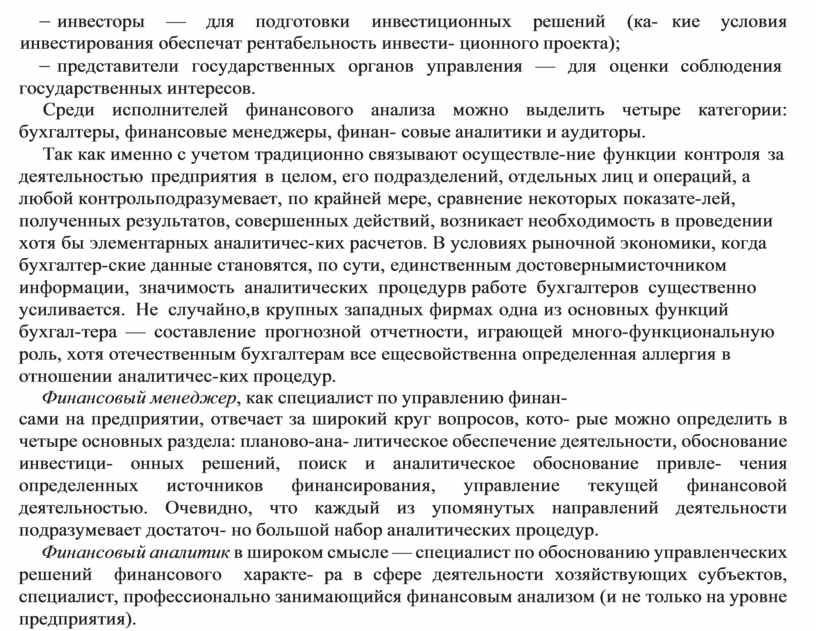 Среди исполнителей финансового анализа можно выделить четыре категории: бухгалтеры, финансовые менеджеры, финан- совые аналитики и аудиторы.