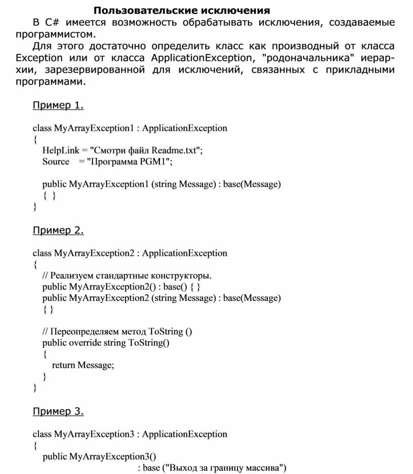 Для этого достаточно определить класс как производный от класса Exception или от класса ApplicationException, "родоначальника" иерар- хии, зарезервированной для исключений, связанных с прикладными программами.