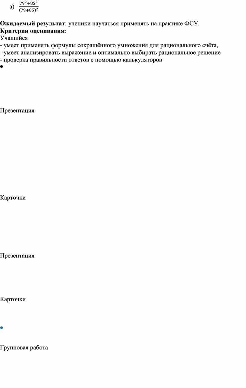 Ожидаемый результат: ученики научаться применять на практике ФСУ. Критерии оценивания: Учащийся - умеет применять формулы сокращённого умножения для рационального счёта, -умеет анализировать выражение и оптимально выбирать рациональное решение - проверка правильности ответов с помощью калькуляторов