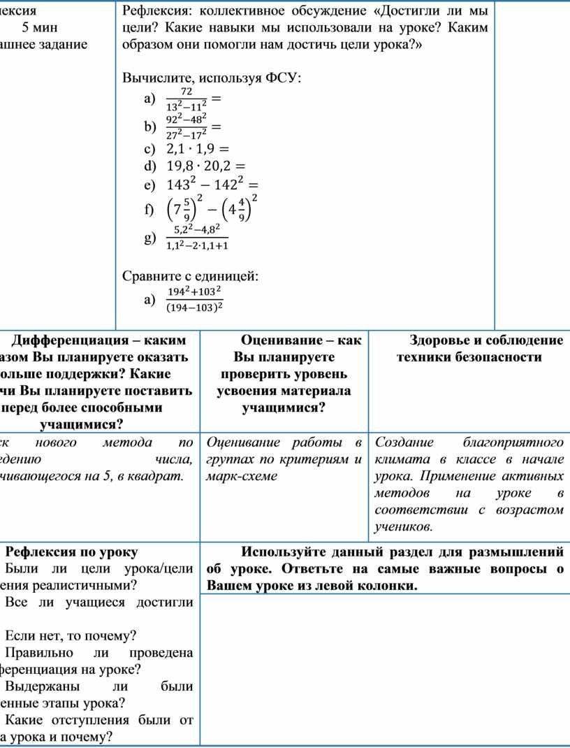 10) Ожидаемый результат:ученики научаться, устно, находить квадраты чисел, используя ФСУ Критерии оценивания: Учащийся - умеет применять формулы сокращённого умножения для рационального счёта, -умеет анализировать выражение и оптимально выбирать рациональное решение - проверка правильности ответов с помощью калькуляторов