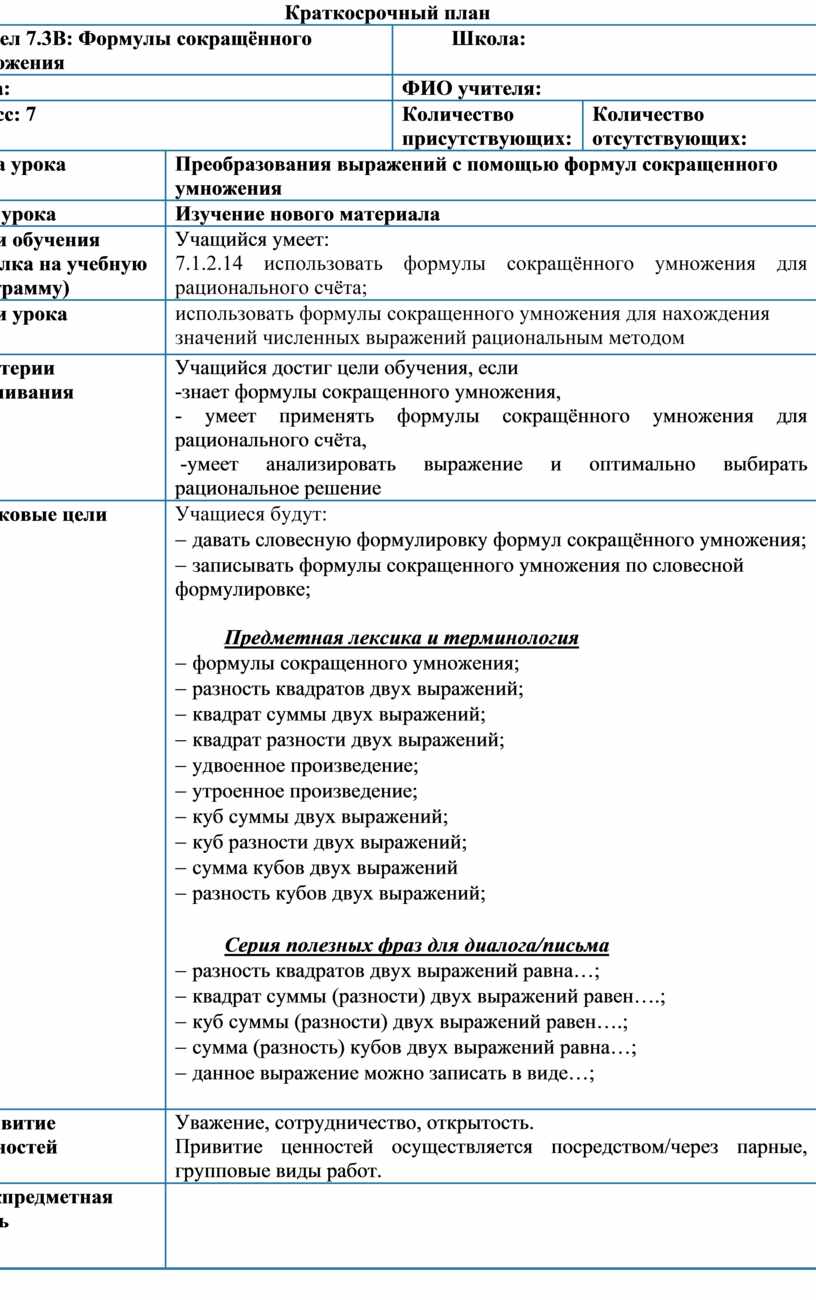 Учащийся умеет: 7.1.2.14 использовать формулы сокращённого умножения для рационального счёта; |