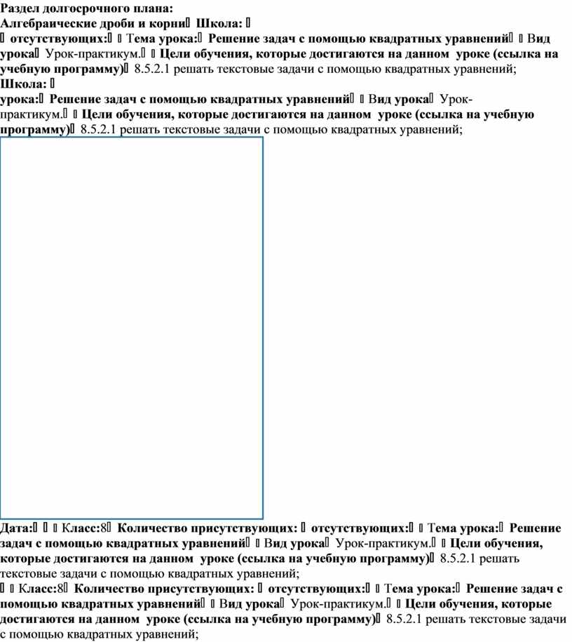 Раздел долгосрочного плана: Алгебраические дроби и корни |