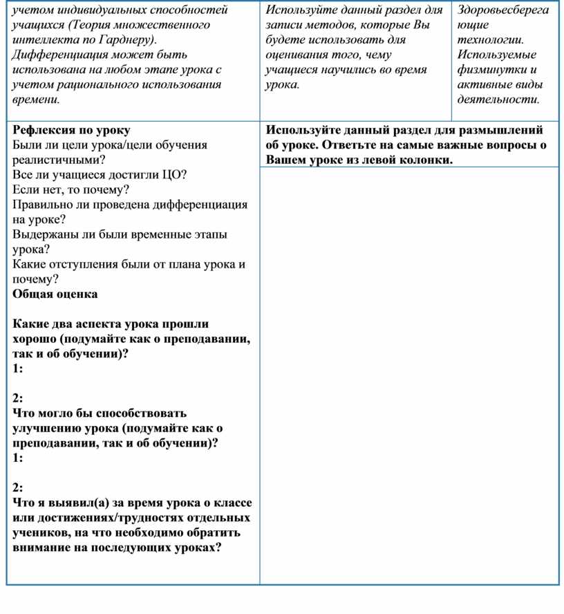 Используйте данный раздел для размышлений об уроке. Ответьте на самые важные вопросы о Вашем уроке из левой колонки. |