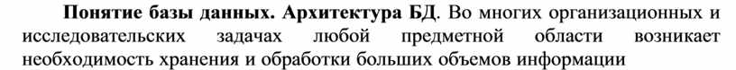 Понятие базы данных. Архитектура БД. Во многих организационных и исследовательских задачах любой предметной области возникает необходимость хранения и обработки больших объемов информации