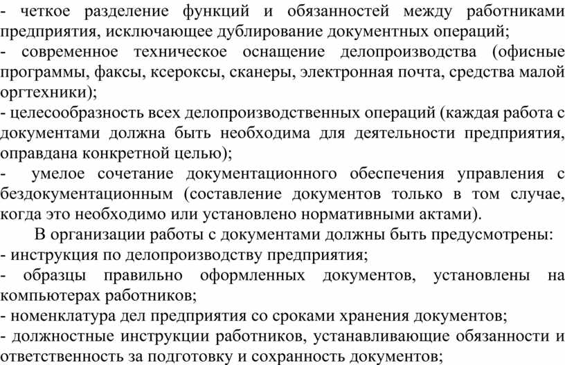 - целесообразность всех делопроизводственных операций (каждая работа с документами должна быть необходима для деятельности предприятия, оправдана конкретной целью);