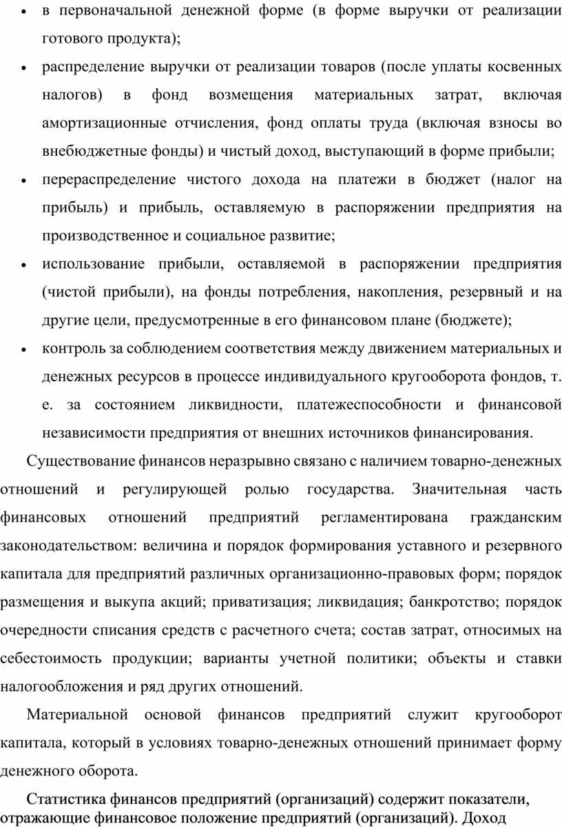 Существование финансов неразрывно связано с наличием товарно-денежных отношений и регулирующей ролью государства. Значительная часть финансовых отношений предприятий регламентирована гражданским законодательством: величина и порядок формирования уставного и резервного капитала для предприятий различных организационно-правовых форм; порядок размещения и выкупа акций; приватизация; ликвидация; банкротство; порядок очередности списания средств с расчетного счета; состав затрат, относимых на себестоимость продукции; варианты учетной политики; объекты и ставки налогообложения и ряд других отношений.