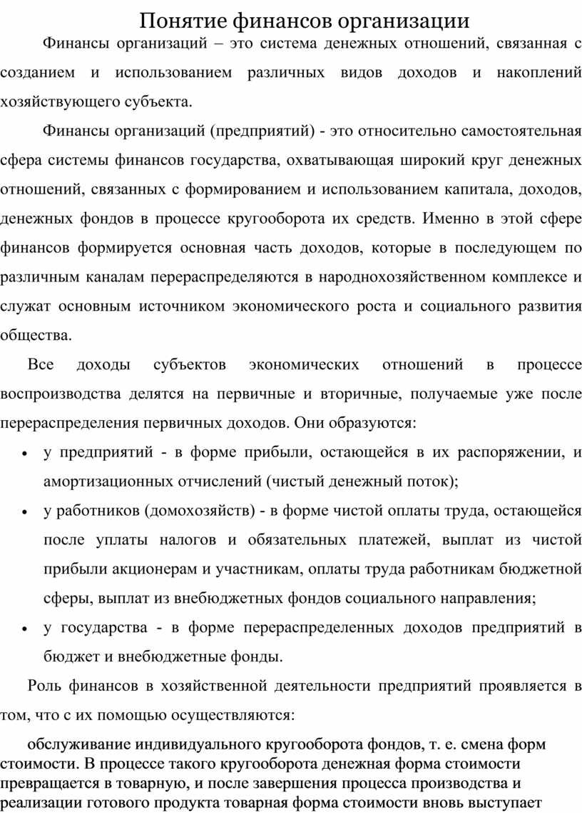 Финансы организаций (предприятий) - это относительно самостоятельная сфера системы финансов государства, охватывающая широкий круг денежных отношений, связанных с формированием и использованием капитала, доходов, денежных фондов в процессе кругооборота их средств. Именно в этой сфере финансов формируется основная часть доходов, которые в последующем по различным каналам перераспределяются в народнохозяйственном комплексе и служат основным источником экономического роста и социального развития общества.