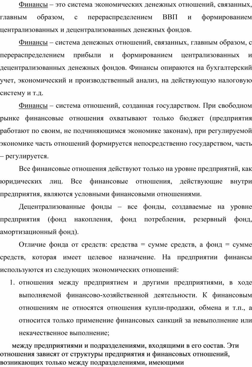 Финансы – это система экономических денежных отношений, связанных, главным образом, с перераспределением ВВП и формированием централизованных и децентрализованных денежных фондов.