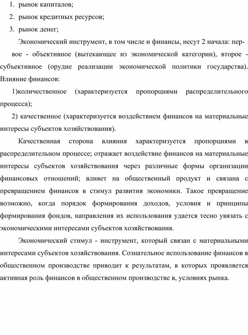 2) качественное (характеризуется воздействием финансов на материальные интересы субъектов хозяйствования).