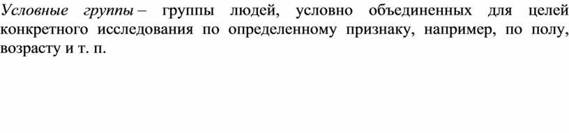 Условные группы – группы людей, условно объединенных для целей конкретного исследования по определенному признаку, например, по полу, возрасту и т. п.