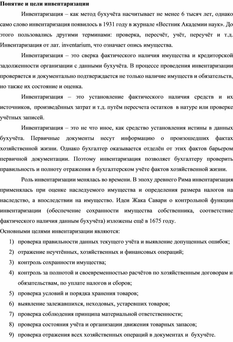 Инвентаризация – это установление фактического наличия средств и их источников, произведённых затрат и т.д. путём пересчета остатков в натуре или проверке учётных записей.
