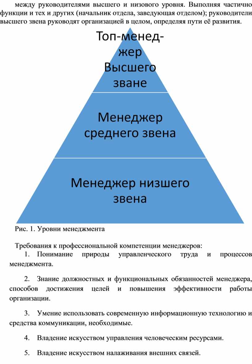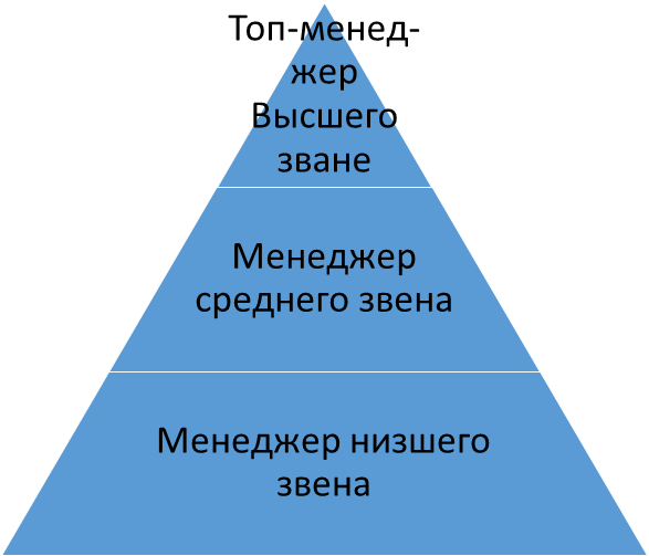 Вертикальное разделение труда приводит к выделению менеджеров высшего, среднего и низшего уровня или звена. Руководителям низового звена подчинены непосредственно исполнители (бригадир, мастер, старший кассир); руководители среднего звена являются своеобразными передаточными звеньями между руководителями высшего и низового уровня. Выполняя частично функции и тех и других (начальник отдела, заведующая отделом); руководители высшего звена руководят организацией в целом, определяя пути её развития.