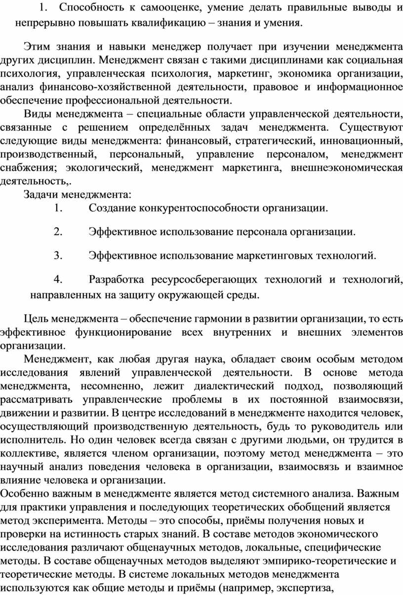 Этим знания и навыки менеджер получает при изучении менеджмента других дисциплин. Менеджмент связан с такими дисциплинами как социальная психология, управленческая психология, маркетинг, экономика организации, анализ финансово-хозяйственной деятельности, правовое и информационное обеспечение профессиональной деятельности.