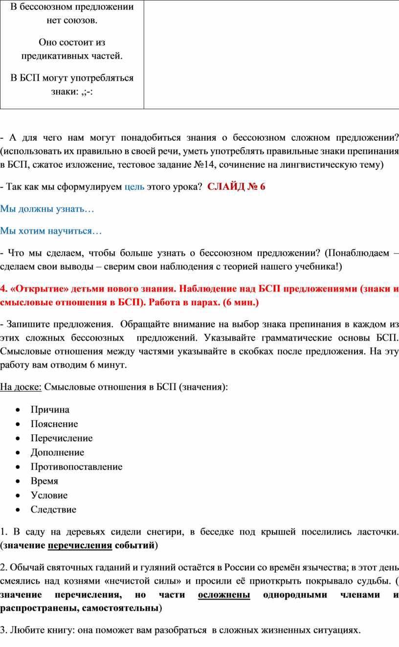 4. «Открытие» детьми нового знания. Наблюдение над БСП предложениями (знаки и смысловые отношения в БСП). Работа в парах. (6 мин.)