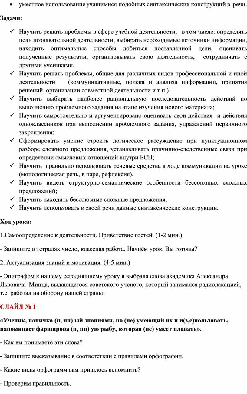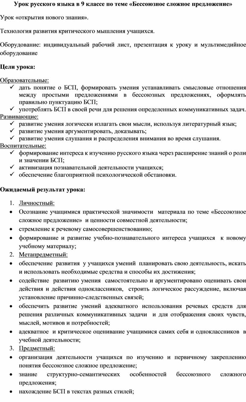 Урок русского языка в 9 классе по теме «Бессоюзное сложное предложение»