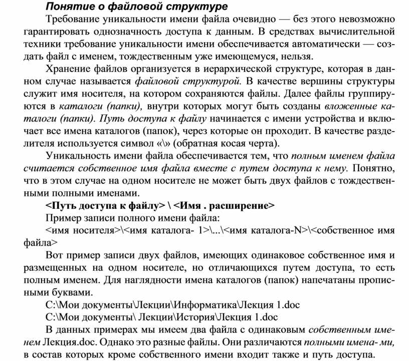 В данных примерах мы имеем два файла с одинаковым собственным име- нем Лекция.doc. Однако это разные файлы. Они различаются полными имена- ми, в состав которых кроме собственного имени входит также и путь доступа.