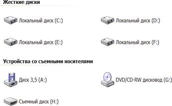 Память компьютера операционная система организует в виде логических дисков. Имена А:\ и В:\ зарезервированы за гибкими дисками. Имя жёсткого диска обычно С:\. Т.к. ёмкость винчестера велика, его удобно делить на несколько логических дисков, например, С:\ и D:\.