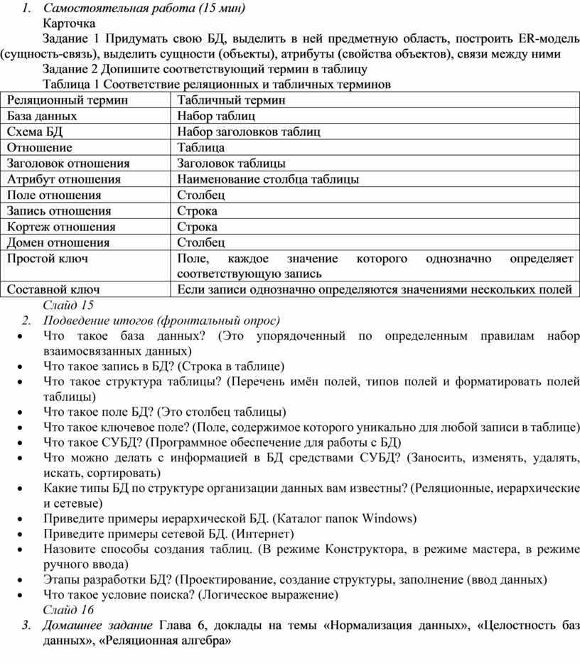 6. Домашнее задание Глава 6, доклады на темы «Нормализация данных», «Целостность баз данных», «Реляционная алгебра»