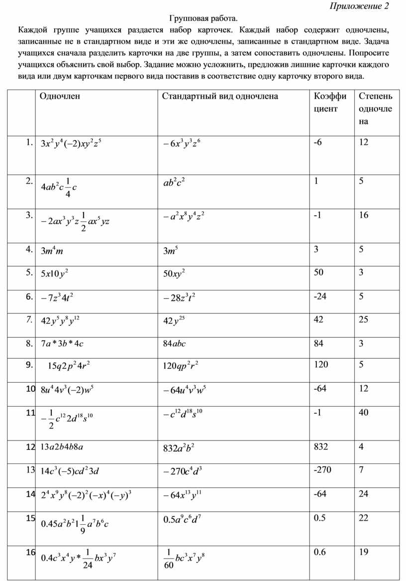 Каждой группе учащихся раздается набор карточек. Каждый набор содержит одночлены, записанные не в стандартном виде и эти же одночлены, записанные в стандартном виде. Задача учащихся сначала разделить карточки на две группы, а затем сопоставить одночлены. Попросите учащихся объяснить свой выбор. Задание можно усложнить, предложив лишние карточки каждого вида или двум карточкам первого вида поставив в соответствие одну карточку второго вида.