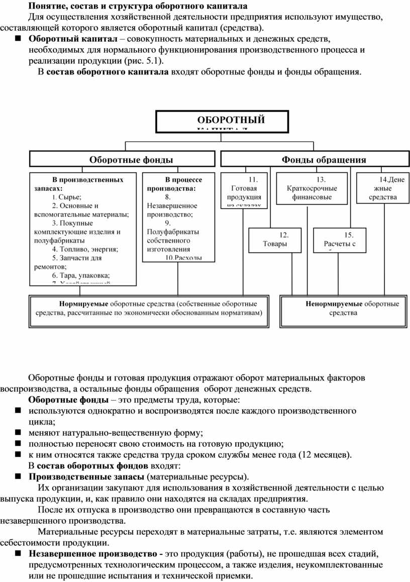 n Оборотный капитал – совокупность материальных и денежных средств, необходимых для нормального функционирования производственного процесса и реализации продукции (рис. 5.1).