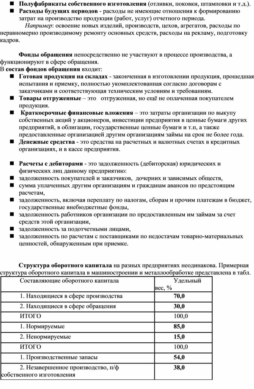 Структура оборотного капитала на разных предприятиях неодинакова. Примерная структура оборотного капитала в машиностроении и металлообработке представлена в табл.