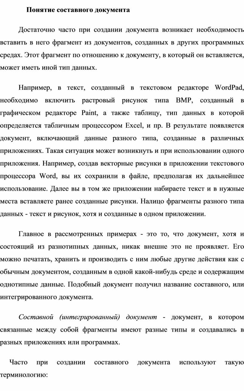 Составной (интегрированный) документ - документ, в котором связанные между собой фрагменты имеют разные типы и создавались в разных приложениях или программах.