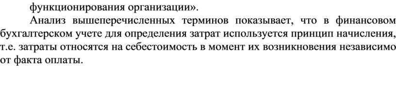 Анализ вышеперечисленных терминов показывает, что в финансовом бухгалтерском учете для определения затрат используется принцип начисления, т.е. затраты относятся на себестоимость в момент их возникновения независимо от факта оплаты.