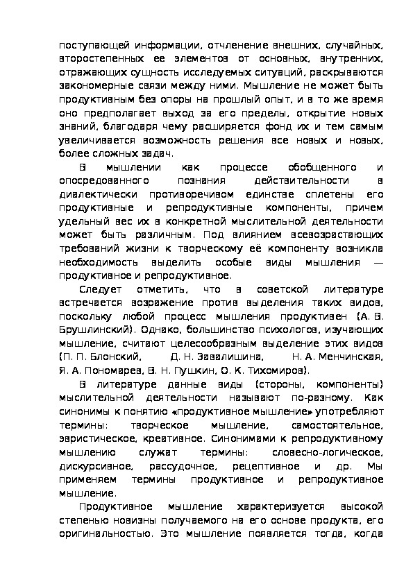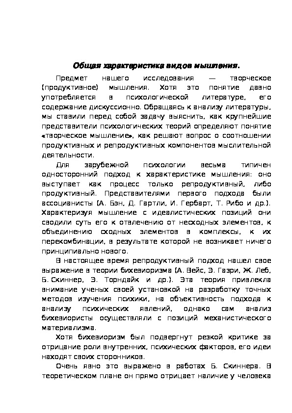 Как процесс репродуктивный, процесс, в результате которого не возникает ничего принципиально нового, а происходит лишь перекомбинация исходных элементов, рассматривали мышление ассоцианисты (А. Бен, Д. Гартли). В настоящее время этот подход нашел свое выражение в бихевиоризме (А. Вейс, Б. Скиннер).