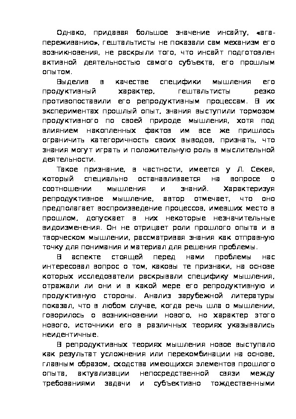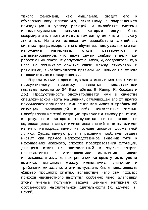 Выразителями другого подхода к мышлению как к чисто продуктивному процессу являлись представители гештальтпсихологии (М. Вертгаймер, В. Келлер, К. Кофка и др.).