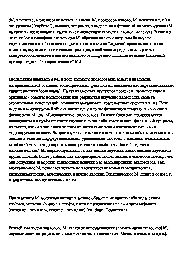 (т. е. по средствам М.); по характеру моделируемых объектов; по сферам приложения М.(М. в технике, в физических науках, в химии, М. процессов живого, М. психики и т. п.) и