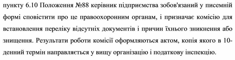 пункту 6.10 Положення №88 керівник підприємства зобов'язаний у писемній формі сповістити про це правоохоронним органам, і призначає комісію для встановлення переліку відсутніх документів і причин їхнього зникнення або знищення. Результати роботи комісії оформляються актом, копія якого в 10- денний термін направляється у вищу організацію і податкову інспекцію.