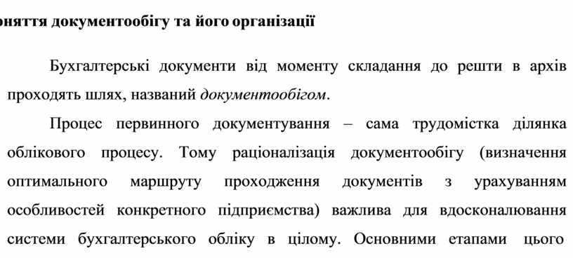 Процес первинного документування – сама трудомістка ділянка облікового процесу. Тому раціоналізація документообігу (визначення оптимального маршруту проходження документів з урахуванням особливостей конкретного підприємства) важлива для вдосконалювання системи бухгалтерського обліку в цілому. Основними етапами цього