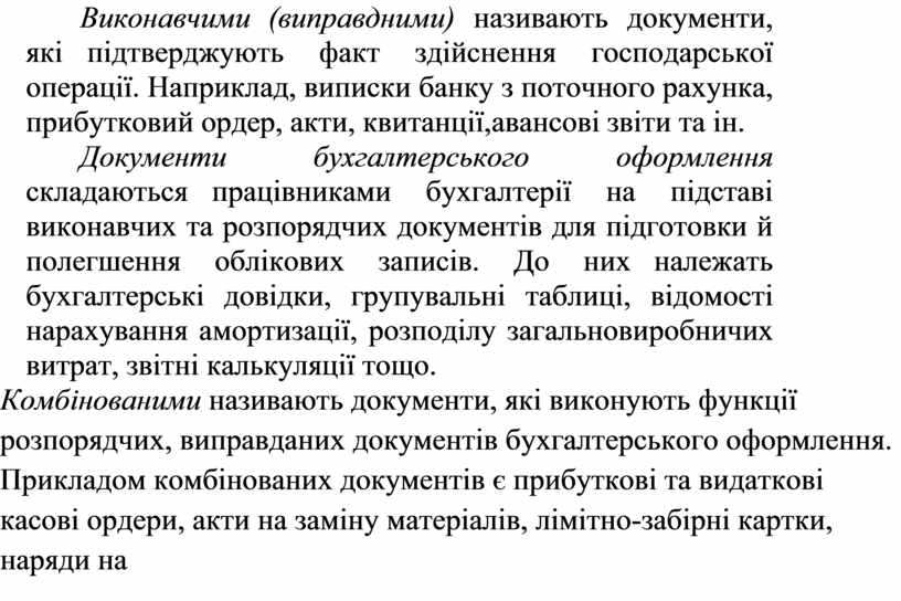 Виконавчими (виправдними) називають документи, які підтверджують факт здійснення господарської операції. Наприклад, виписки банку з поточного рахунка, прибутковий ордер, акти, квитанції, авансові звіти та ін.