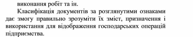 Класифікація документів за розглянутими ознаками дає змогу правильно зрозуміти їх зміст, призначення і використання для відображення господарських операцій підприємства.
