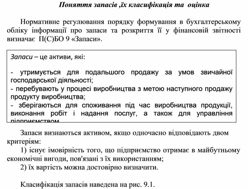 Нормативне регулювання порядку формування в бухгалтерському обліку інформації про запаси та розкриття її у фінансовій звітності визначає П(С)БО 9 «Запаси».