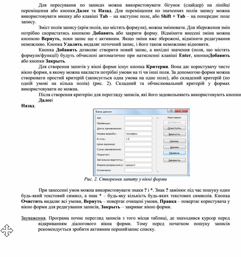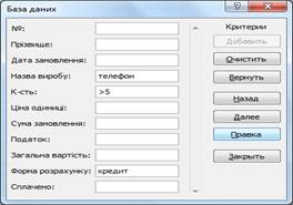 При занесенні умов можна використовувати знаки ? і *. Знак ? замінює під час пошуку один будь-який текстовий символ, а знак * – будь-яку кількість будь-яких текстових символів. Кнопка Очистить видаляє всі умови, Вернуть – повертає очищені умови, Правка – повертає користувача у вікно форми для редагування записів, Закрыть – закриває вікно форми.