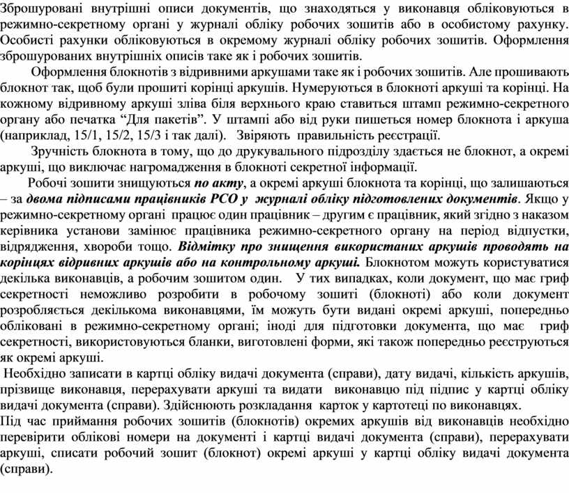 Робочі зошити (блокноти), які видаються виконавцям для разового користування, повинні мати жорстку прокладку, що виключають можливість залишення відбитків документа, який складається.
