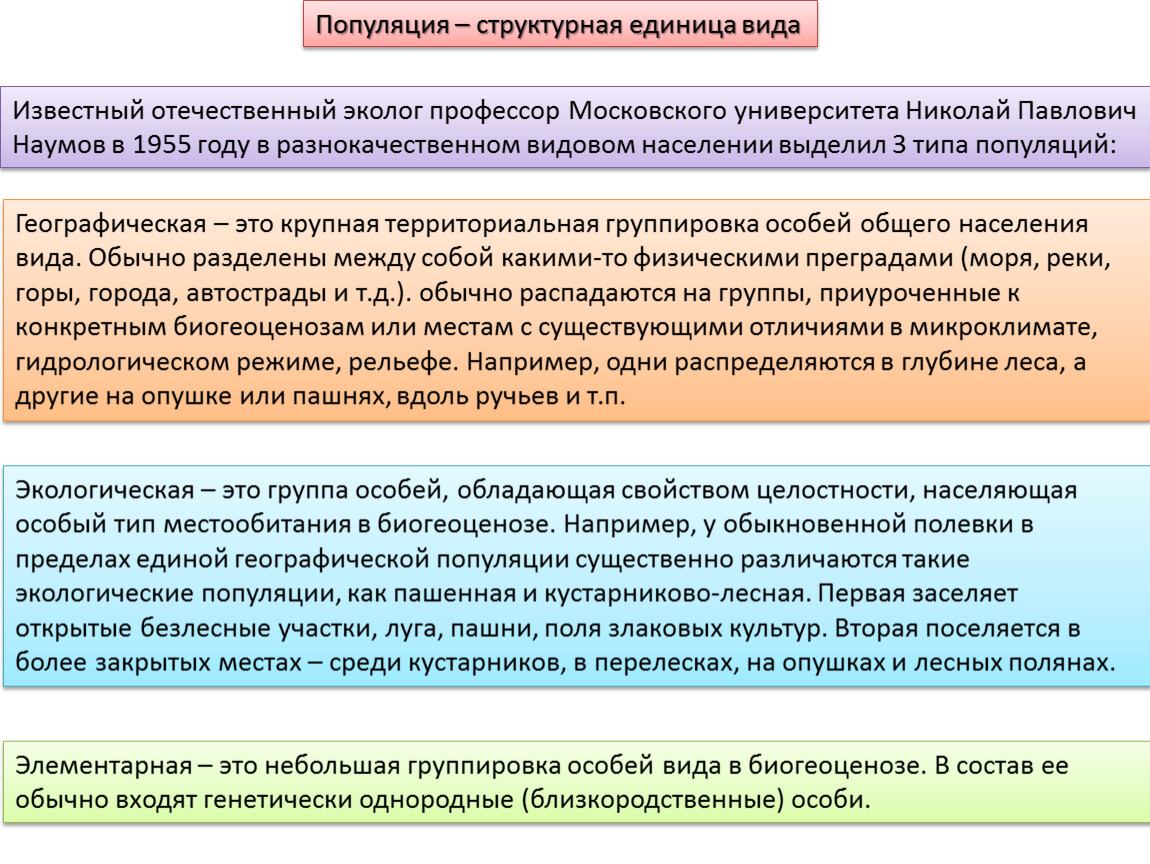 Известный отечественный эколог профессор Московского университета Николай Павлович Наумов в 1955 году в разнокачественном видовом населении выделил 3 типа популяций: