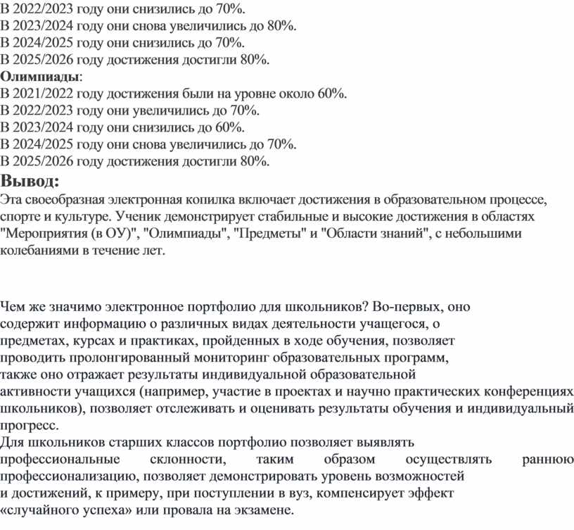 Эта своеобразная электронная копилка включает достижения в образовательном процессе, спорте и культуре. Ученик демонстрирует стабильные и высокие достижения в областях "Мероприятия (в ОУ)", "Олимпиады", "Предметы" и "Области знаний", с небольшими колебаниями в течение лет.