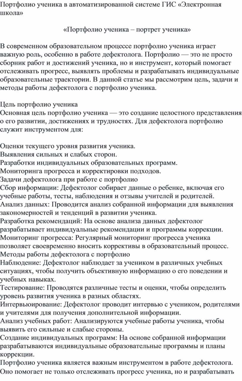В современном образовательном процессе портфолио ученика играет важную роль, особенно в работе дефектолога. Портфолио — это не просто сборник работ и достижений ученика, но и инструмент, который помогает отслеживать прогресс, выявлять проблемы и разрабатывать индивидуальные образовательные траектории. В данной статье мы рассмотрим цель, задачи и методы работы дефектолога с портфолио ученика.