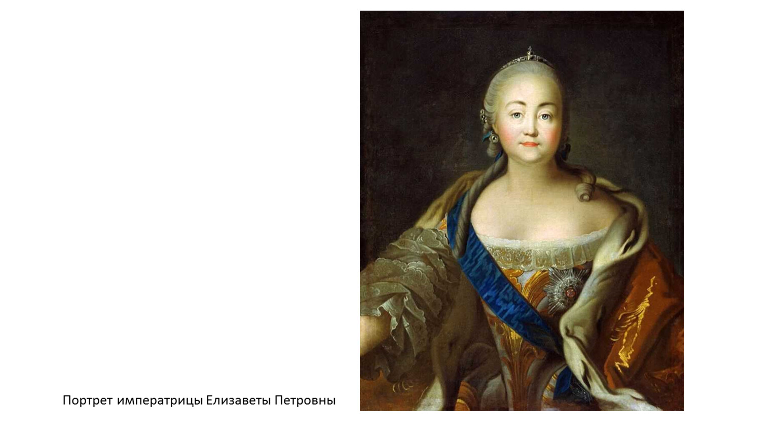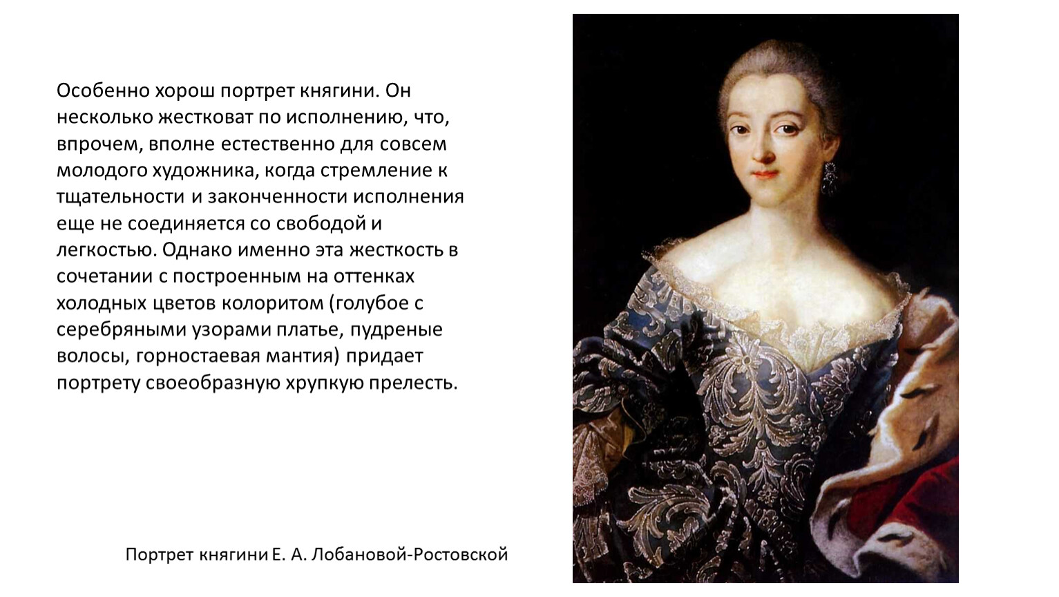Особенно хорош портрет княгини. Он несколько жестковат по исполнению, что, впрочем, вполне естественно для совсем молодого художника, когда стремление к тщательности и законченности исполнения еще не соединяется со свободой и легкостью. Однако именно эта жесткость в сочетании с построенным на оттенках холодных цветов колоритом (голубое с серебряными узорами платье, пудреные волосы, горностаевая мантия) придает портрету своеобразную хрупкую прелесть.