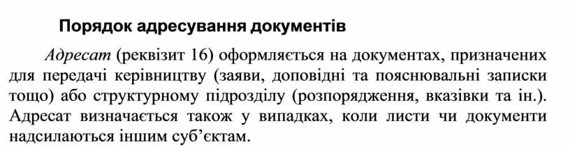 Адресат (реквізит 16) оформляється на документах, призначених для передачі керівництву (заяви, доповідні та пояснювальні записки тощо) або структурному підрозділу (розпорядження, вказівки та ін.). Адресат визначається також у випадках, коли листи чи документи надсилаються іншим суб’єктам.