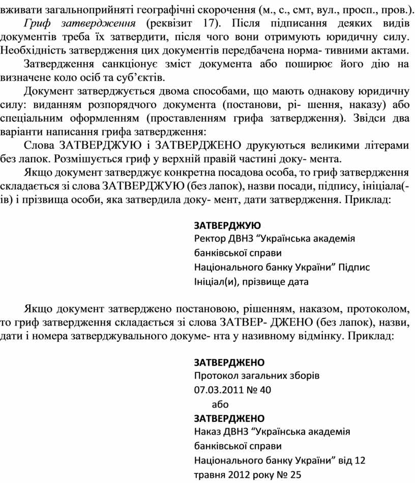 Гриф затвердження (реквізит 17). Після підписання деяких видів документів треба їх затвердити, після чого вони отримують юридичну силу. Необхідність затвердження цих документів передбачена норма- тивними актами.