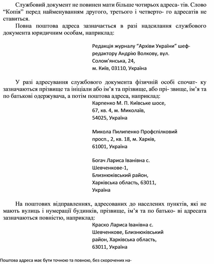 У разі адресування службового документа фізичній особі спочат- ку зазначаються прізвище та ініціали або ім’я та прізвище, або прі- звище, ім’я та по батькові одержувача, а потім поштова адреса, наприклад: